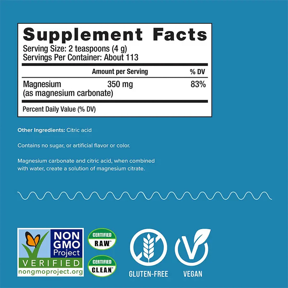 Natural Vitality Calm es una formulación patentada altamente absorbible de citrato de magnesio equilibrado en pH en forma iónica (creado a partir de ácido cítrico y carbonato de magnesio), sabor orgánico, extracto de estevia orgánica.