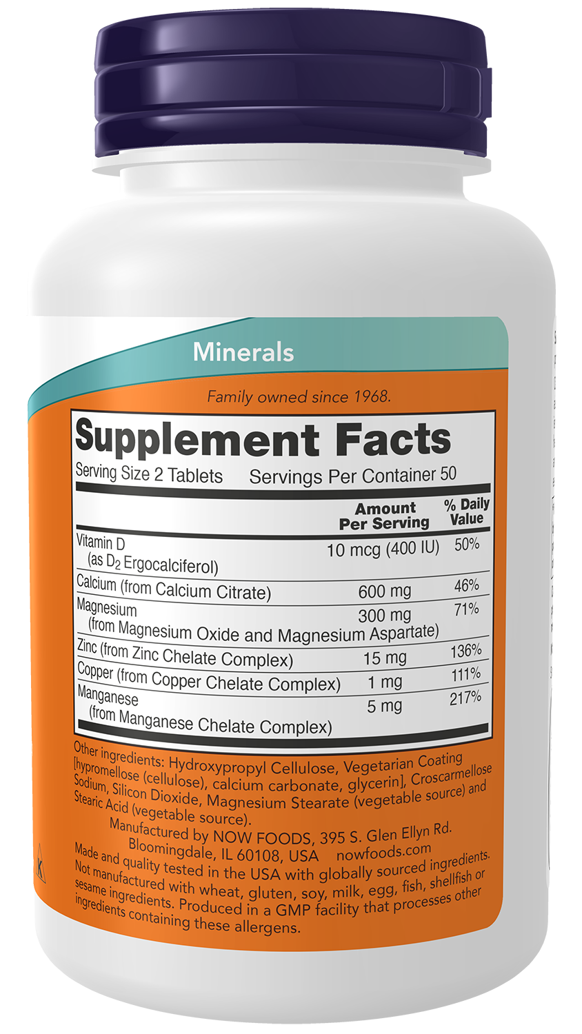 El citrato de calcio es una forma de calcio de fácil digestión y absorción, un mineral necesario. Se han incluido la vitamina D, el magnesio, el zinc, el cobre y el manganeso.